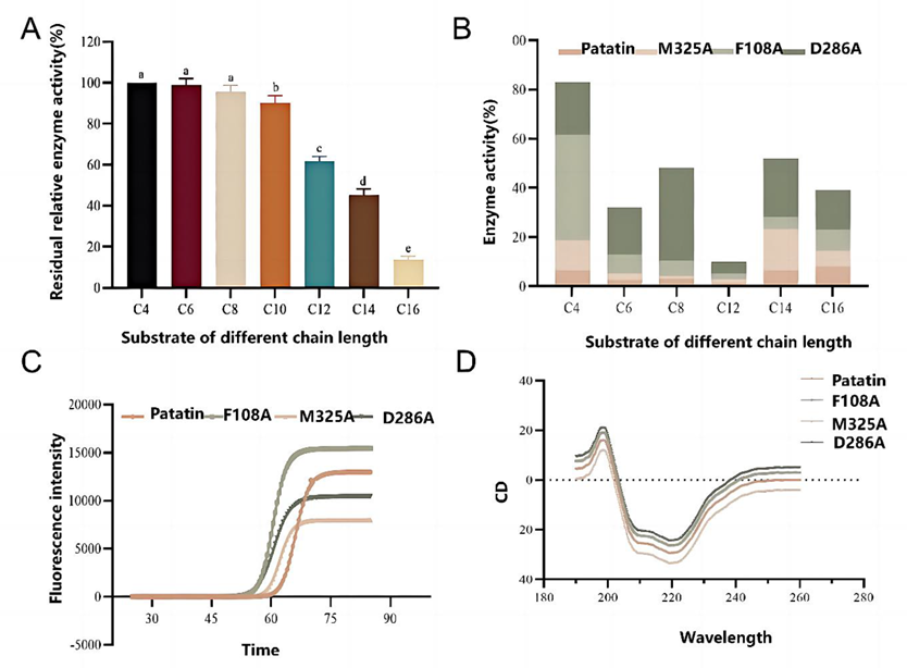 This study demonstrates, for the first time, that rational design can effectively shift Patatin’s substrate preference toward long-chain fatty acids, addressing a long-standing bottleneck in its application. The D286A variant not only expands the enzyme’s catalytic potential but also provides mechanistic insights into how subtle structural changes in local domains can fine-tune substrate specificity. By combining protein engineering with efficient expression, this work sets the stage for broader use of plant-derived lipases in functional lipid production, green biocatalysis, and food biotechnology.