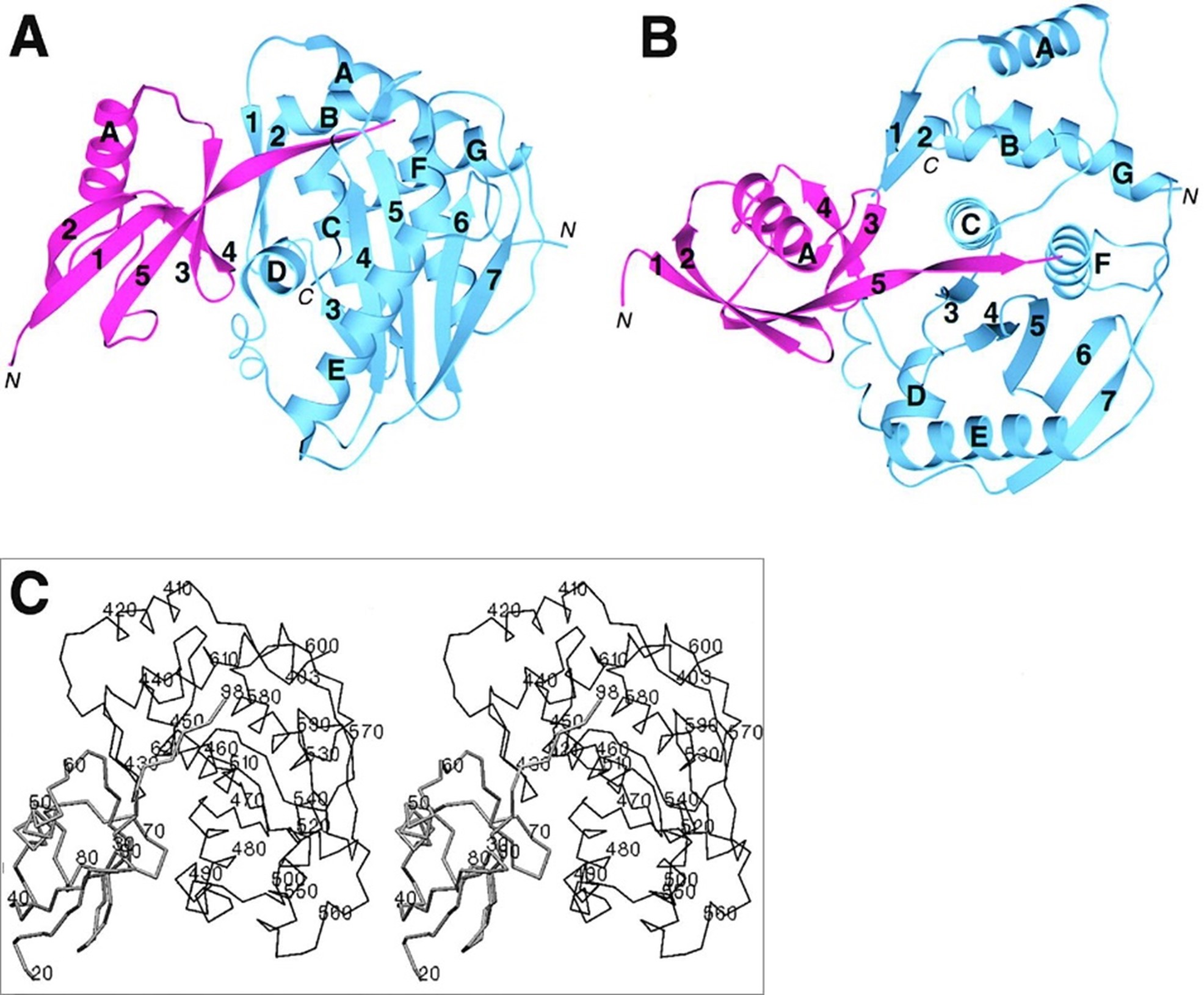 Figure 2. Crystal structure of the Ulp1–SUMO complex (A, B) and detailed view of the active-site pocket (C)