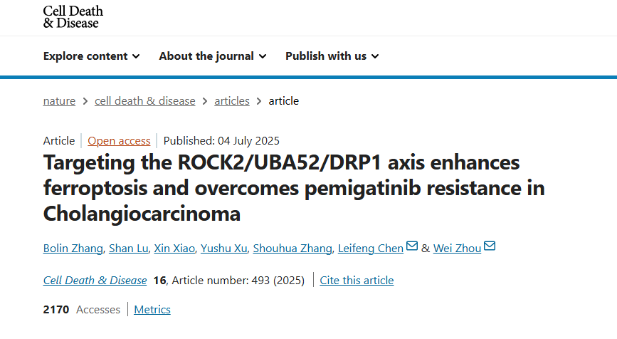 A research team from Jiangxi Cancer Hospital published a study in Cell Death & Disease (DOI: 10.1038/s41419-025-07804-9) revealing the mechanism by which ROCK2 contributes to Pemigatinib resistance in CCA cells, potentially through the regulation of ferroptosis and associated proteins DRP1 and UBA52.