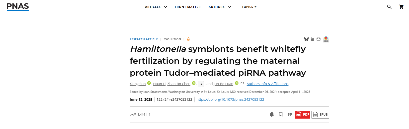 In June 2025, a study published in the Proceedings of the National Academy of Sciences of the United States of America (PNAS) (DOI: 10.1073/pnas.2427053122), revealing that Hamiltonella manipulates host fertilisation by hijacking the core maternal protein Tudor within the host reproductive system. The study demonstrated that Hamiltonella upregulates Tudor protein expression, which in turn modulates specific piRNAs, ultimately influencing oocyte energy metabolism and cytoskeletal reorganisation. This work represents the first elucidation of a complete mechanism by which microbes regulate host reproduction via the piRNA pathway, offering a novel perspective for understanding host–microbe interactions.