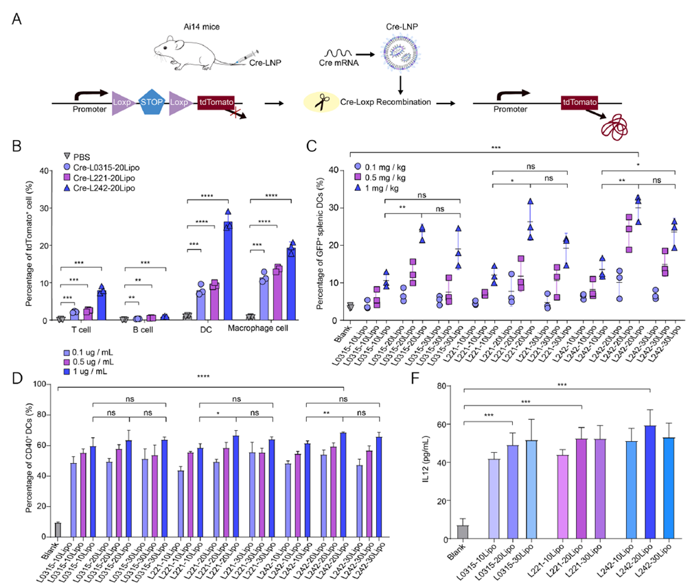 To evaluate the effect of spleen-targeting LNPs on dendritic cells (DCs), mRNA encoding Cre recombinase was delivered in Ai14 reporter mice, with tdTomato expression used to track transfected cell subsets. Results showed that Cre-L242-20Lipo achieved a 27% uptake rate in DCs, 3.4 times higher than the control L0315-20Lipo. Dose-dependent GFP mRNA delivery further confirmed its DC-targeting advantage. After delivering neoantigen mRNA (Hepa-M01-mRNA), CD40 and CD86 expression in DCs increased by 7.5- and 5.7-fold, respectively, while ELISA assays detected significantly elevated IL-12 and TNF-α secretion. These findings indicate that L242-20Lipo effectively promotes antigen uptake and DC activation, establishing a foundation for neoantigen vaccines to induce robust immune responses.