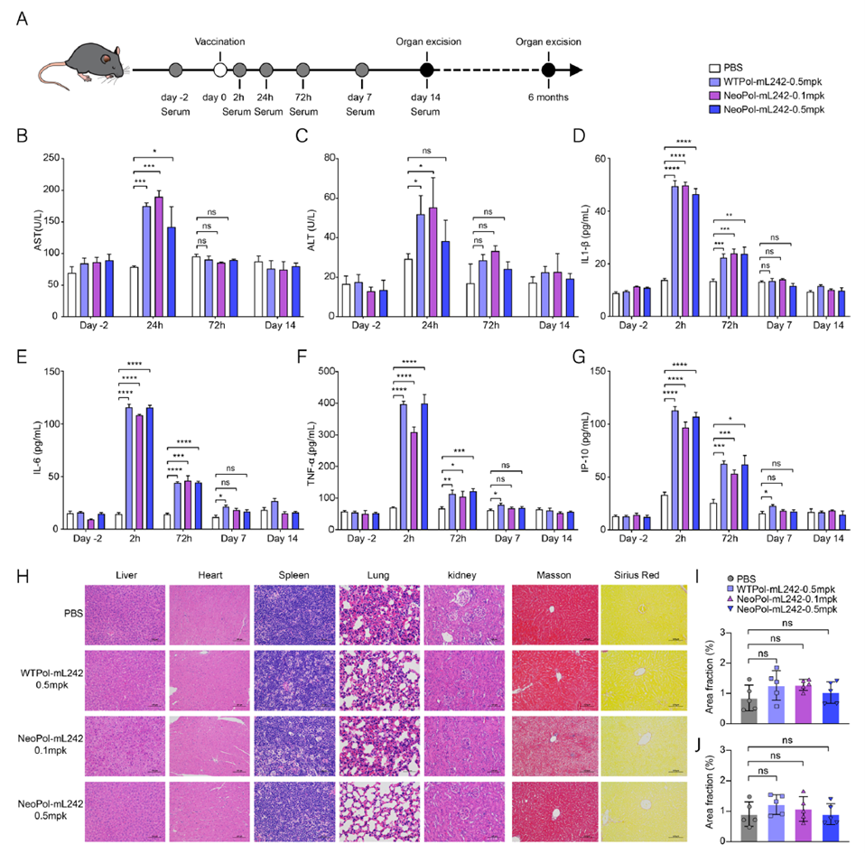 Safety evaluation of the NeoPol-mL242 vaccine in mice involved serum biochemistry and histopathological analysis. Transient elevations in liver enzymes AST and ALT were observed, peaking at 24 hours and returning to normal within 72 hours, with no significant differences in ALP, ALB, or TP levels. ELISA quantification of serum inflammatory cytokines IL-1β, IL-6, TNF-α, and IP-10 showed transient increases 2 hours post-vaccination, returning to baseline within one week. Histopathology of major organs (liver, heart, spleen, lung, kidney) revealed no pathological changes, and no tissue damage was observed six months post-injection. Pharmacokinetic analysis of GFP mRNA-L242-20Lipo showed mRNA residual primarily in the spleen, nearly undetectable after 96 hours. These results confirm that NeoPol-mL242 has no acute toxicity, a favorable safety profile, and induces robust T-cell responses at low doses without significant inflammation or damage.