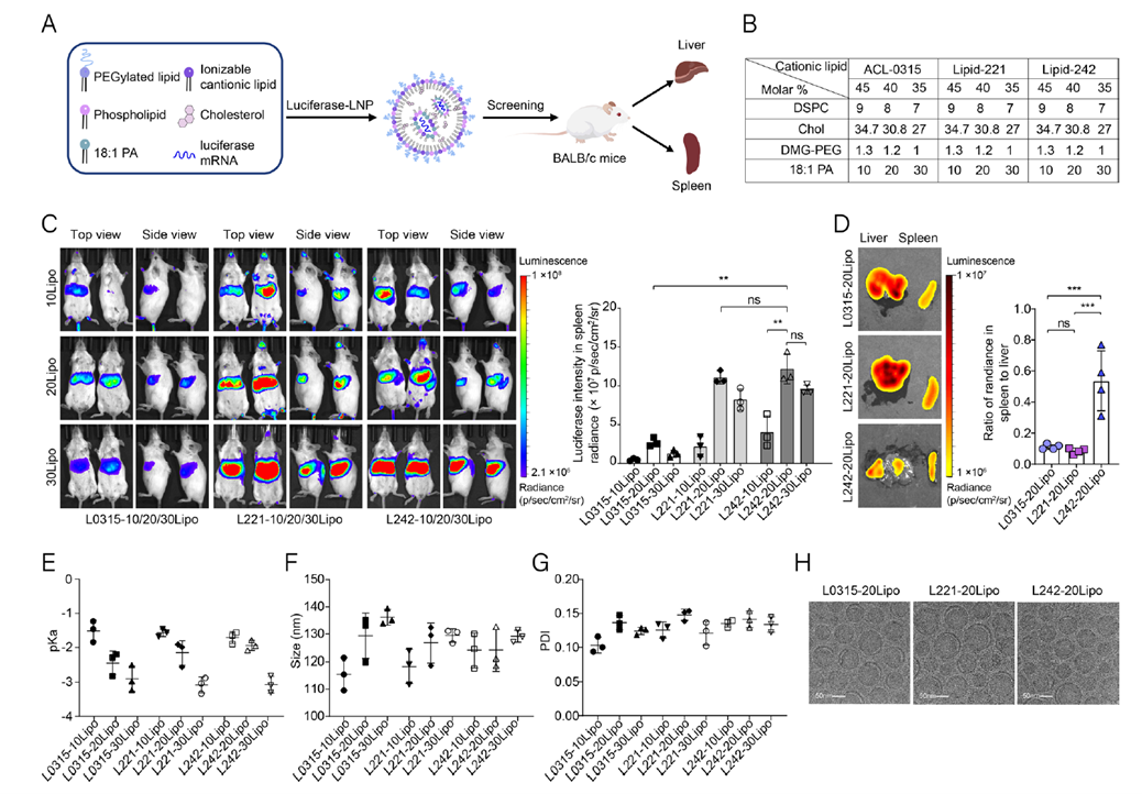 In the initial phase, a library of ionizable lipids was synthesized, identifying 25 candidates. LNPs formulated with 18:1 PA were tested for in vivo GFP mRNA delivery, with L221 and L242 showing the highest transfection efficiency. Further optimization of the L242-20Lipo molar ratio demonstrated significant spleen accumulation and minimal liver distribution in luciferase mRNA delivery experiments, with a spleen-to-liver signal ratio 4.5 times higher than controls. Physicochemical characterization confirmed that surface charge modulation enhanced spleen selectivity (Fig. 2E-H), laying the foundation for subsequent immune targeting.