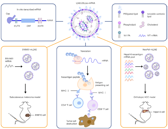 This study focuses on the application of the spleen-targeting NeoPol-mL242 mRNA vaccine in a hepatocellular carcinoma (HCC) model. By optimizing the L242-20Lipo delivery system, efficient spleen-selective mRNA delivery and DC activation were achieved, significantly reducing hepatotoxicity. In melanoma and HCC models, the vaccine successfully induced robust T-cell responses, effectively inhibiting tumor growth and prolonging survival, demonstrating its outstanding potential in cancer immunotherapy.